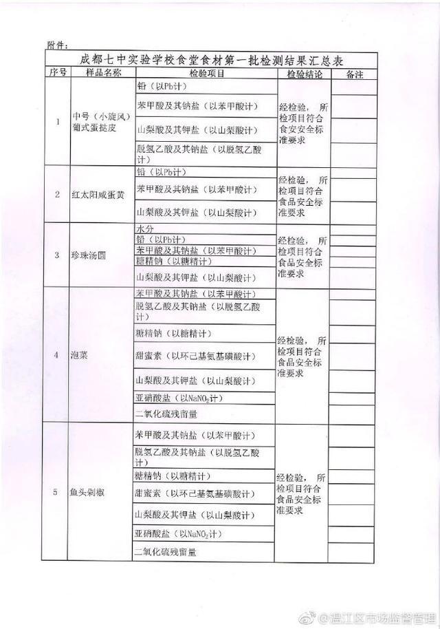 四川發(fā)布客戶端消息 今天下午,溫江區(qū)市場監(jiān)督管理局官微@溫江區(qū)市場監(jiān)督管理 發(fā)布關(guān)于成都七中實驗學(xué)校食堂食材第一批檢測結(jié)果的通報。通報中表示,所取樣品均在保質(zhì)期內(nèi)。