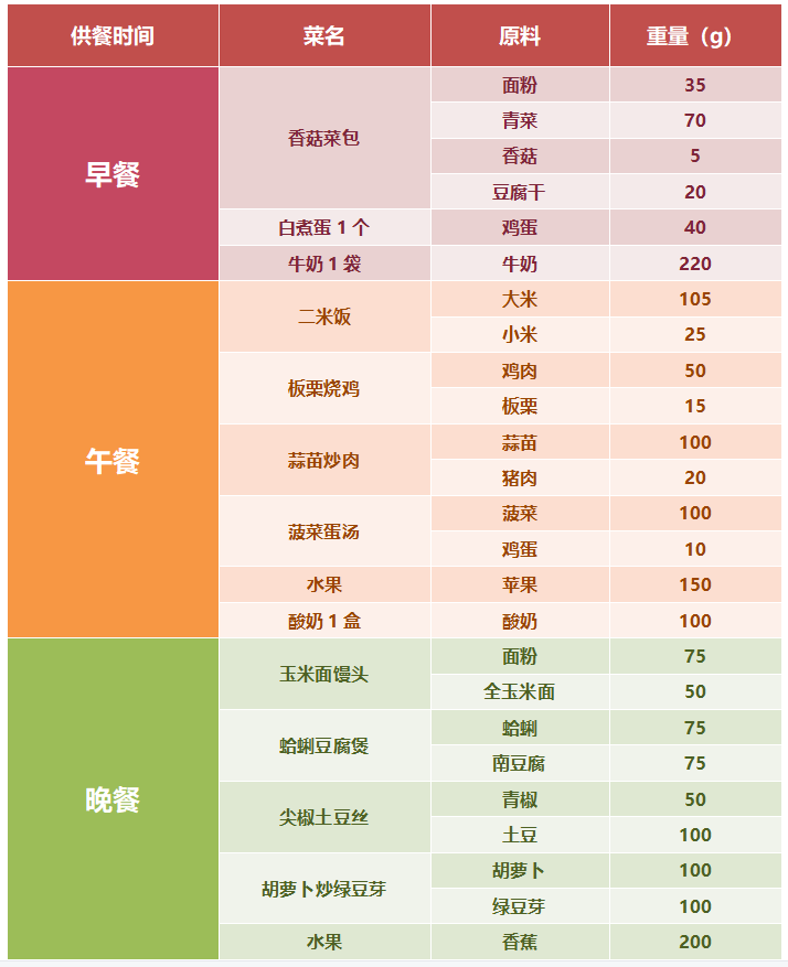 在配餐和烹飪方面,制定合理團(tuán)餐膳食配餐計劃。食物種類要符合《中國居民膳食指南》的推薦要求,優(yōu)先采用減少營養(yǎng)成分損失和保持自然風(fēng)味的食物烹飪方法,少用炸、煎、熏、烤等。每一餐食譜中提供至少3類食物,同類食物之間可進(jìn)行品種互換(見表格)。