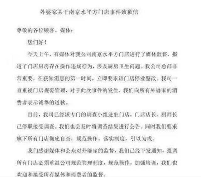對于上述視頻中外婆家存在的問題,3月15日中午,公司創(chuàng)始人吳國平做出回應(yīng):發(fā)布致歉信稱向廣大消費者致歉,對門店進行整改并處罰相關(guān)責(zé)任人,并表示將會對涉事門店進行停業(yè)整頓。